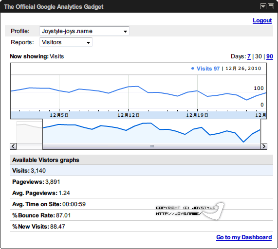 如果你和J同学一样把iGoogle作为浏览器首页,这个方式还是不错的~这个Gadget可以直观的显示出你的网站一周、一个月、三个月的Visitors、Traffic Sources、Content、Goals等主要指标,一目了然。可以通过http://www.google.com/ig/directory?url=www.gstatic.com/ig/modules/analytics/analytics.xml应用到iGoogle,或者直接在iGoogle里添加http://www.gstatic.com/ig/modules/analytics/analytics.xml同样可以。